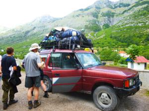 V polovině cesty, v nejvyšším bodě cesty (1700 m n.m.) zastavujeme. Je tam kříž, všude kamení a krásné výhledy do okolní hornaté krajiny. Po odpočinku z náročné jízdy pokračujeme v cestě až do Thethi. V závěru cesty přichází přeháňka a tak někteří z nás mají mokré batohy. Tato dobrodružná cesta nám celkem trvala dvě hodiny. Čekáme pod střechou, než přestane pršet a vyrážíme do hor. Po pár metrech dojdeme ke křižovatce a nevíme kudy jít, tak vytahujeme mapu a GPS. Také potkáváme starší manželský pár z Belgie. Ti jdou do Valbony, tedy stejným směrem, jako my. Děláme časté přestávky, protože jdeme stále do kopce.